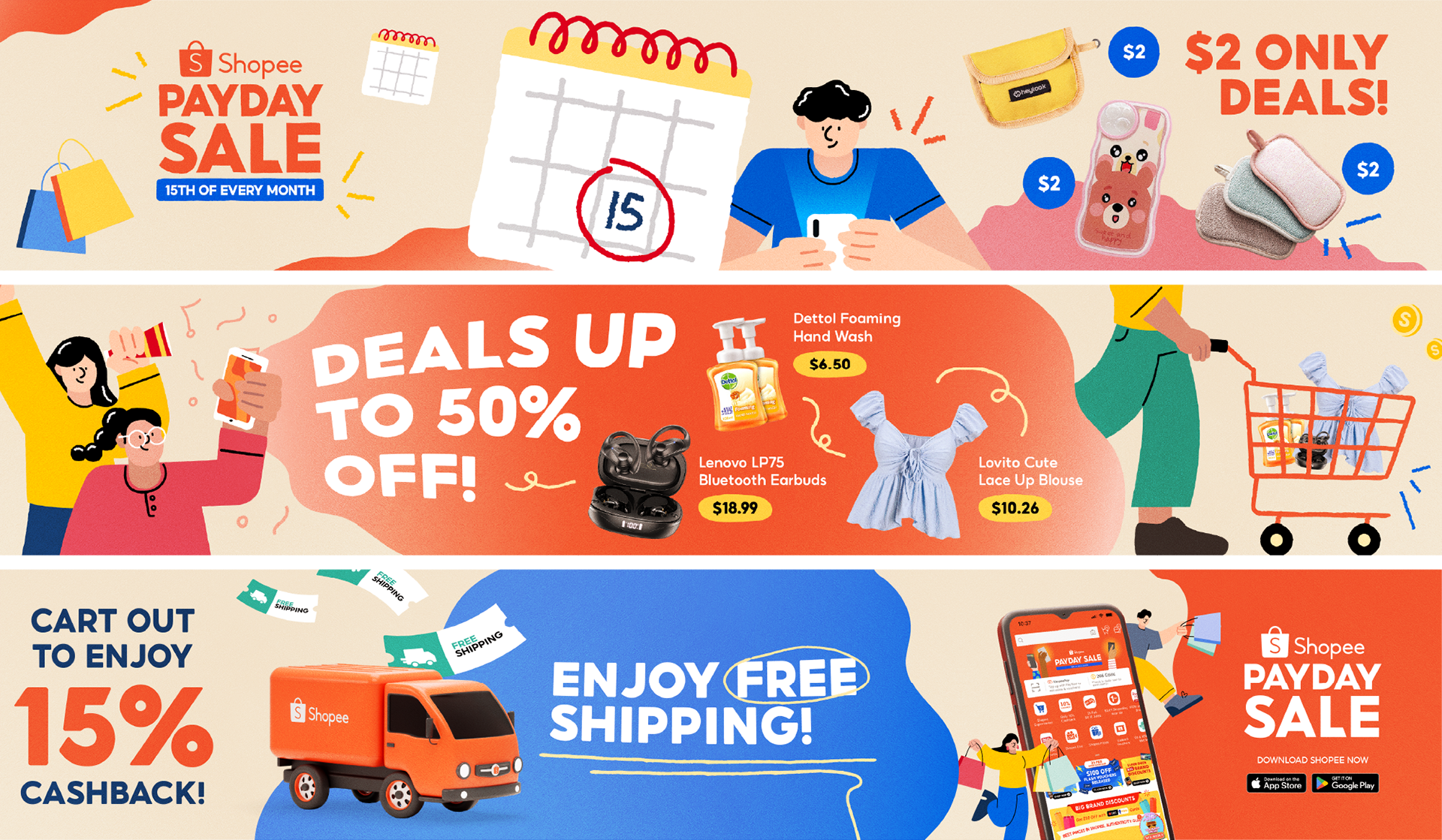 Everyday items and familiar shopping elements reinforce relevance while creating an engaging, approachable environment that encourages users to explore the deals and enjoy the Shopee experience.